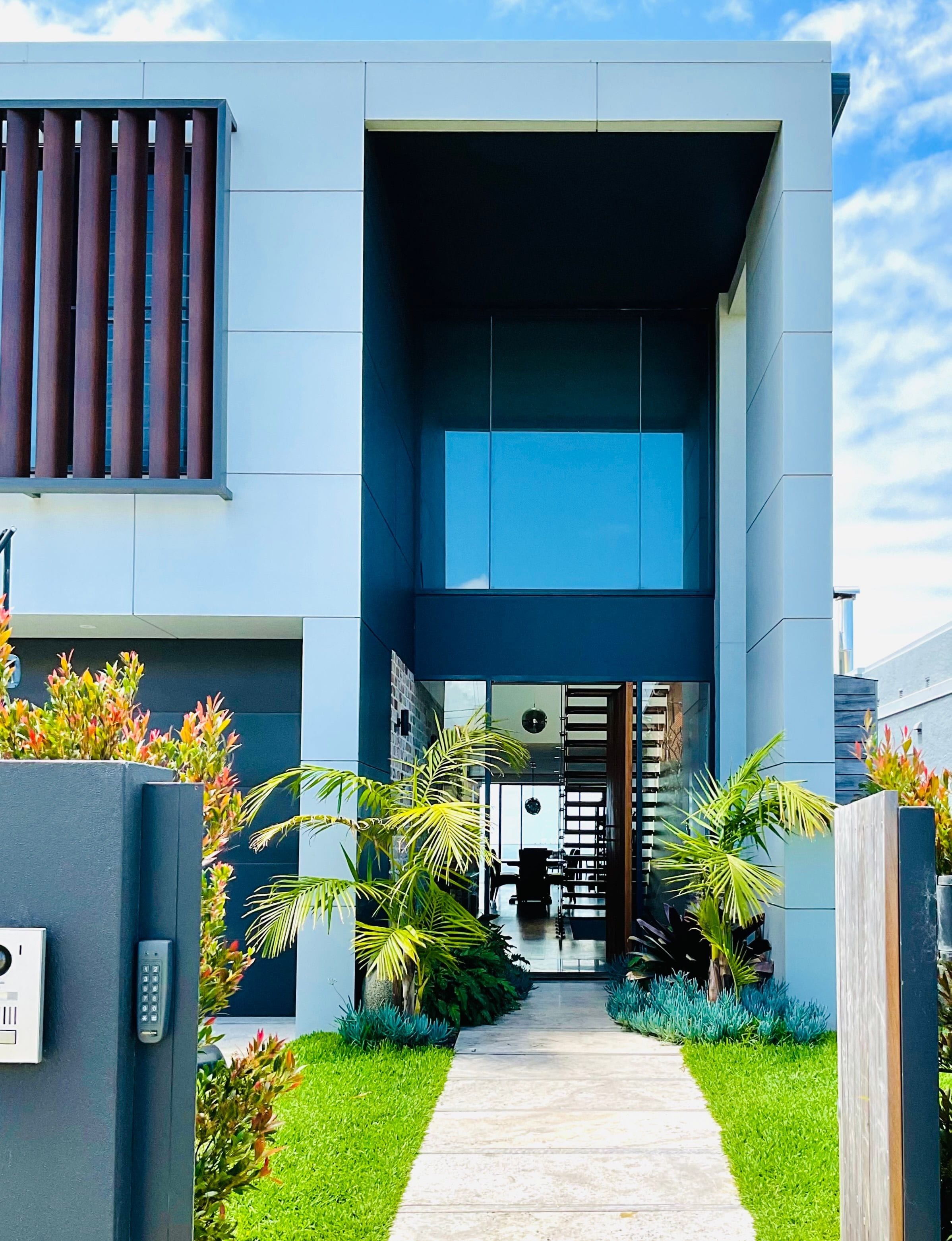 A modern exterior with James Hardie Scyon cladding, off form concrete and feature aluminium transitions to a warm and inviting interior of exposed feature brickwalls, Blackbutt flooring and endless glass to flood the home with light.